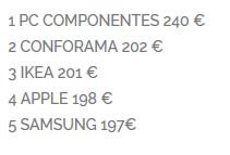Es resaltable que entre el segundo y el tercero realmente tenemos muy poca diferencia en comparación con el cuarto clasificado, el francés Carrefour. Por último en quinto lugar tenemos a Ikea, el gigante de los muebles.